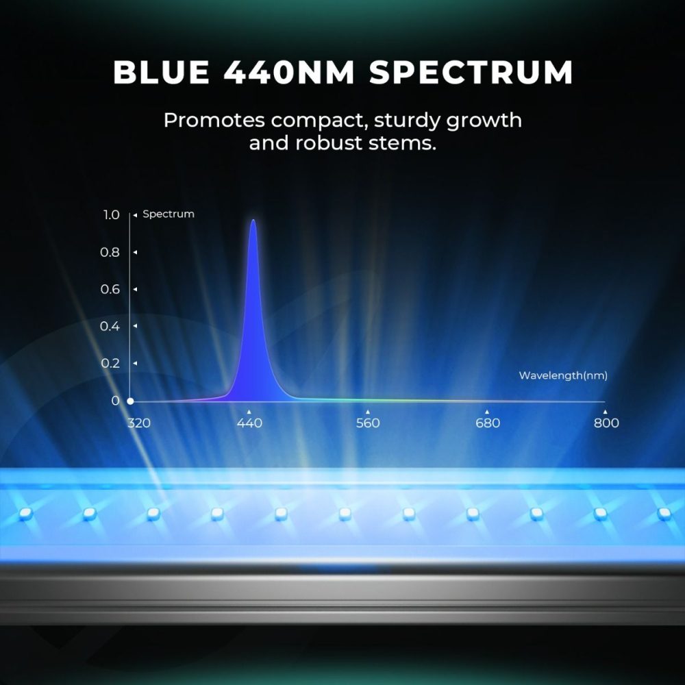 Mars Hydro ADlite Blue55 spektrum, bitkilerde özellikle vejetatif dönemde (yaprak ve gövde gelişimi) etkilidir. 440nm dalga boyunda çalışır.